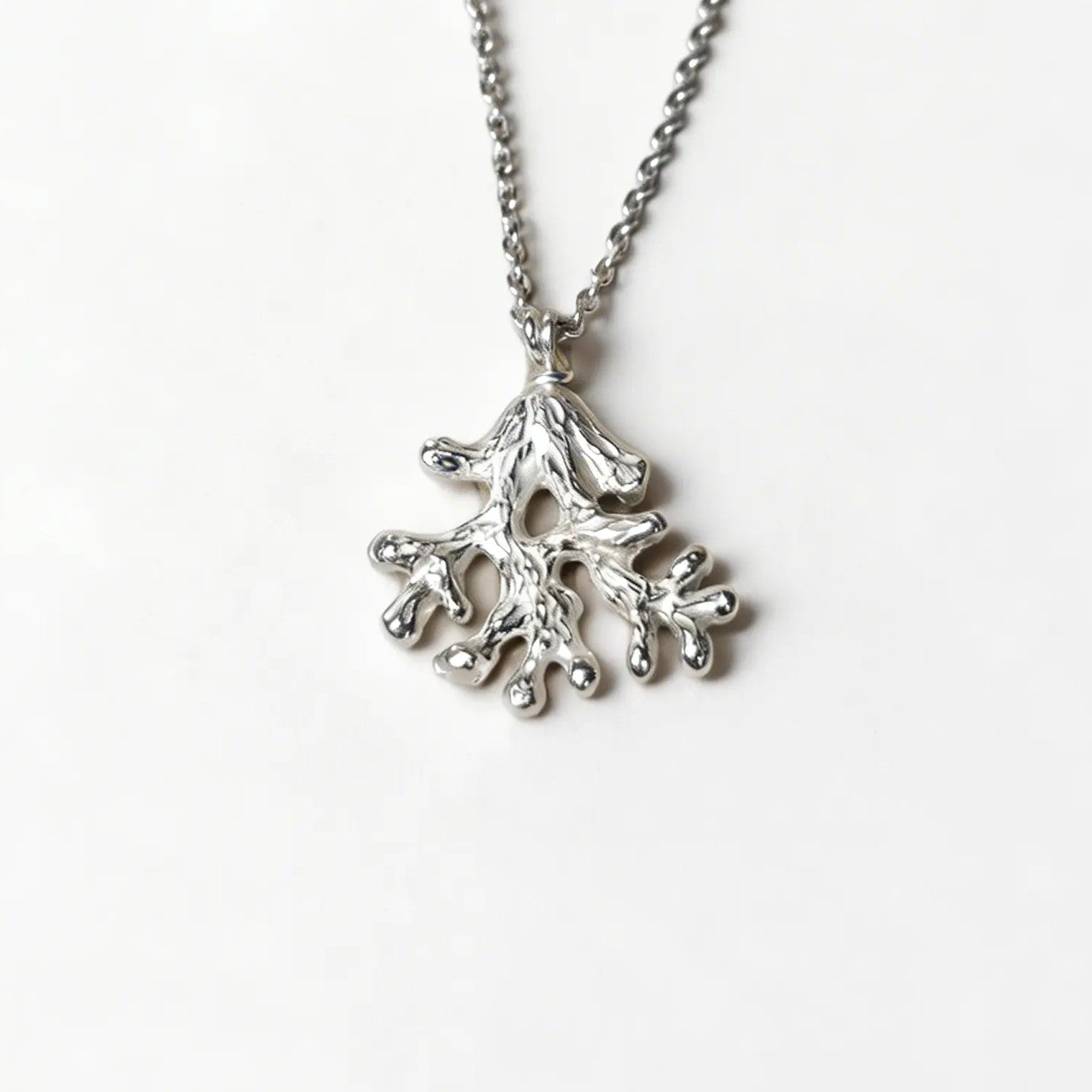From the material strength of bronze and the magnetic allure of the deep, this exclusive necklace is inspired by the organic, sculptural forms of branched coral. The lustrous silver chain contrasts with the vibrant texture of the pendant, celebrating the imperfect and wild beauty of nature. A unique piece, handcrafted for a woman who loves to stand out with contemporary, sophisticated elegance.